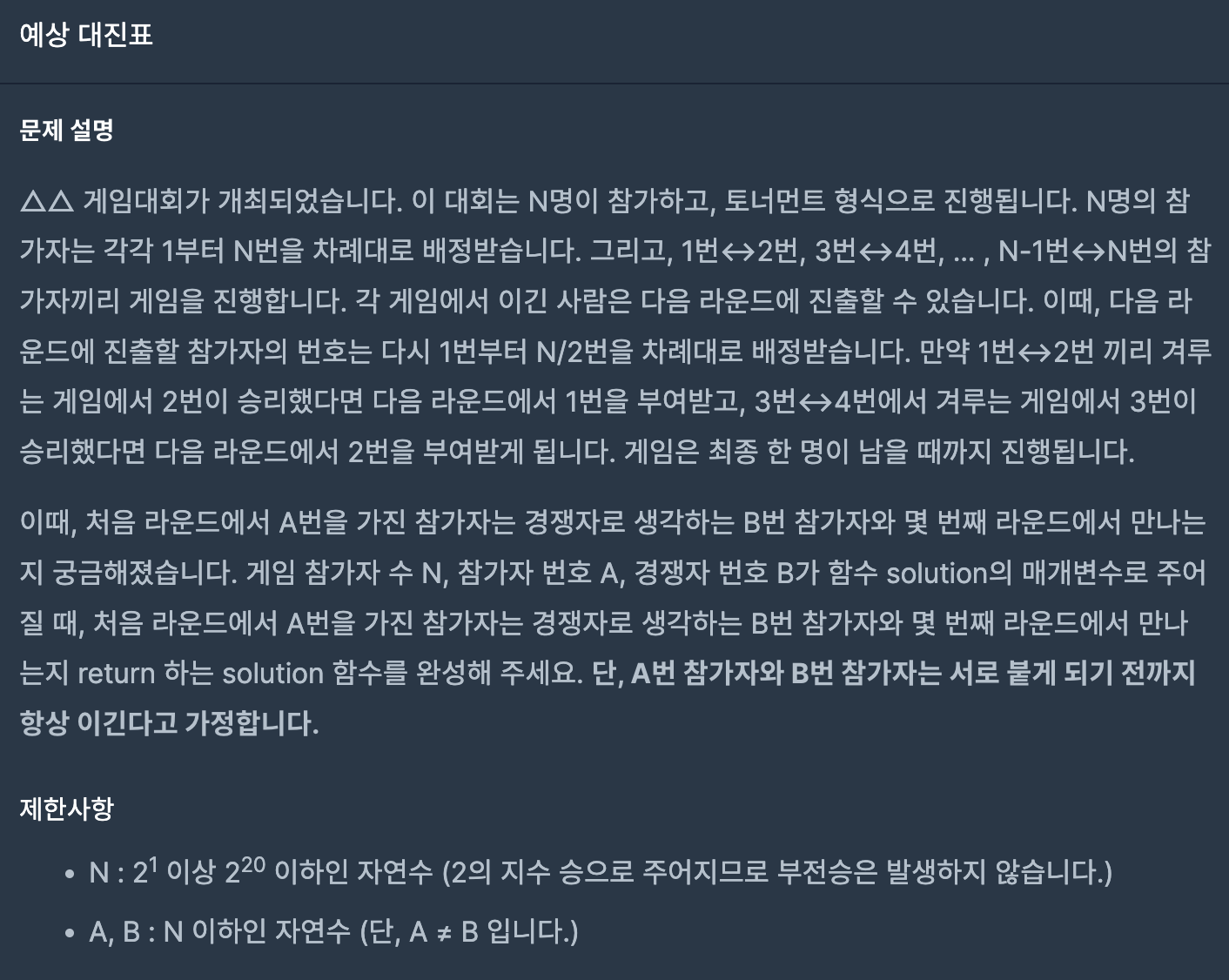 토너먼트 문제이다. 2명씩 짝을 지어 경기를 하며 참가자 번호가 계속 바뀐다.
