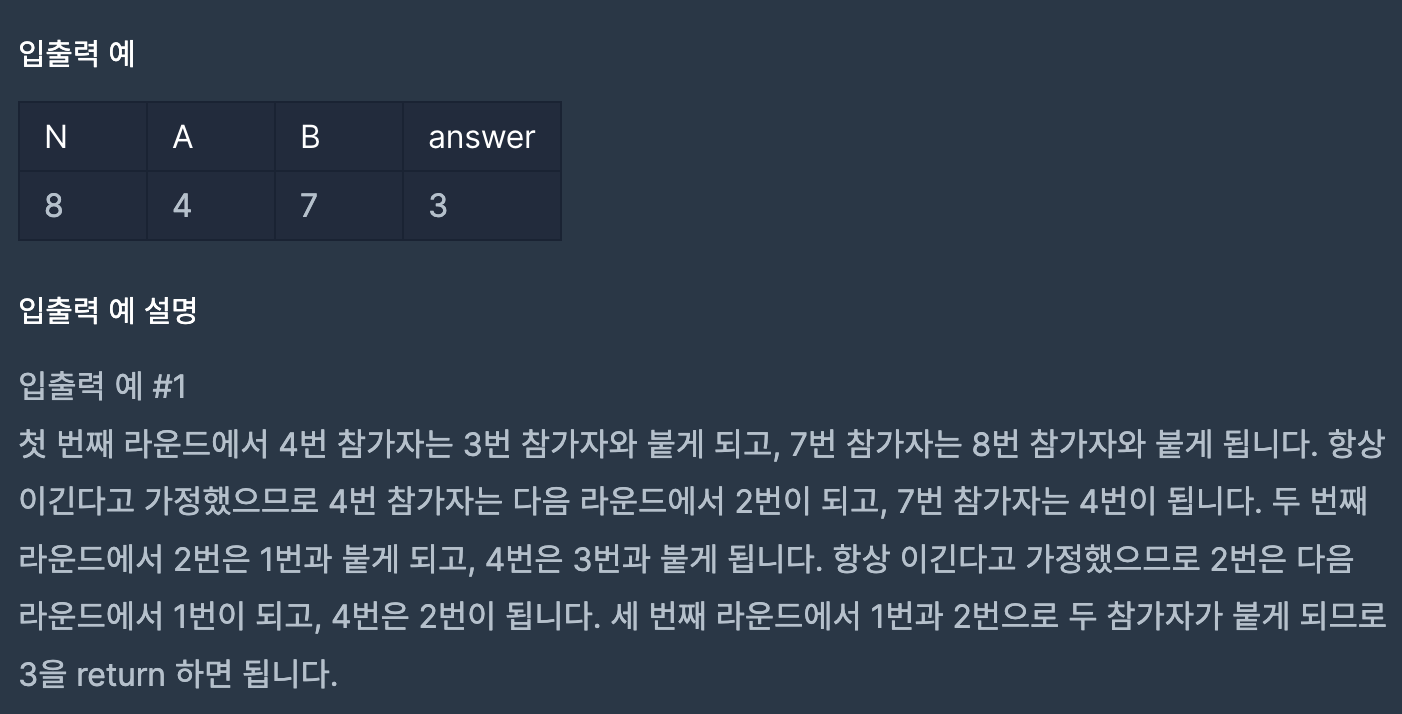 public static int solution(int n, int a, int b)