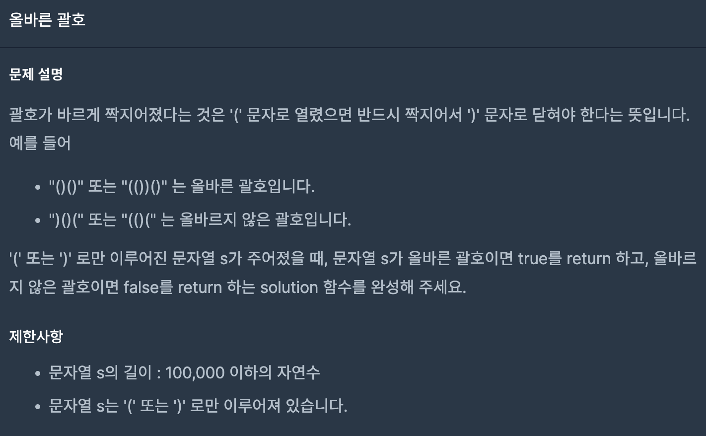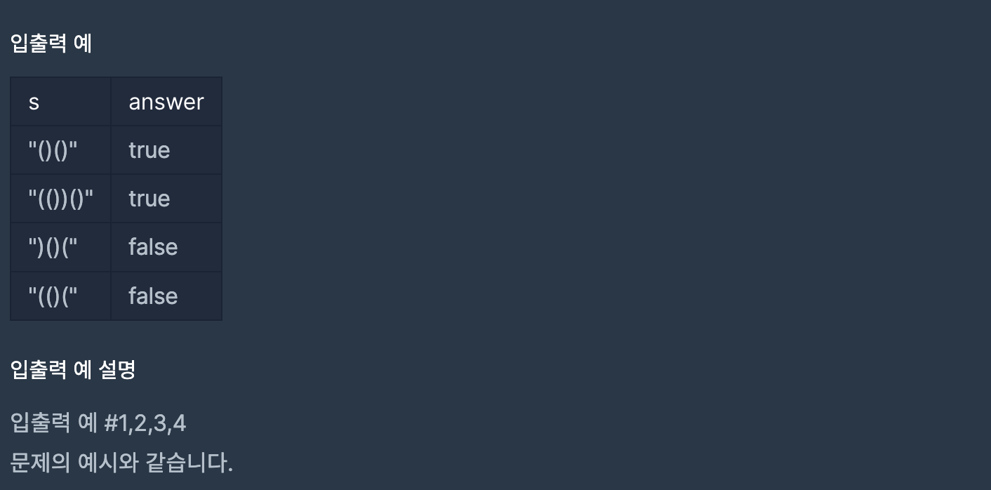 '(' 문자로 시작했으면 짝지어서 ')' 문자로 끝나면 true 반환, 그렇지 않으면 false를 반환한다.