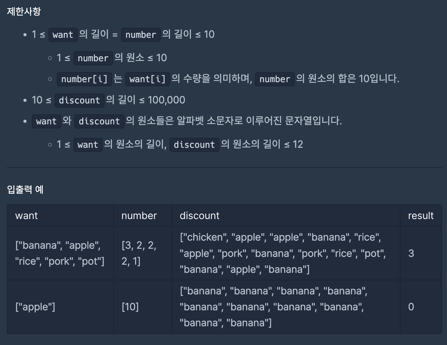 public static int solution(String[] want, int[] number, String[] discount) {