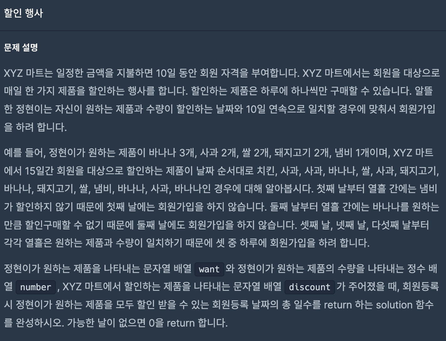 원하는 제품, 원하는 제품의 개수가 있다. 마트에서 매일 한 제품을 할인하는데 하나씩만 구매할 수 있다.