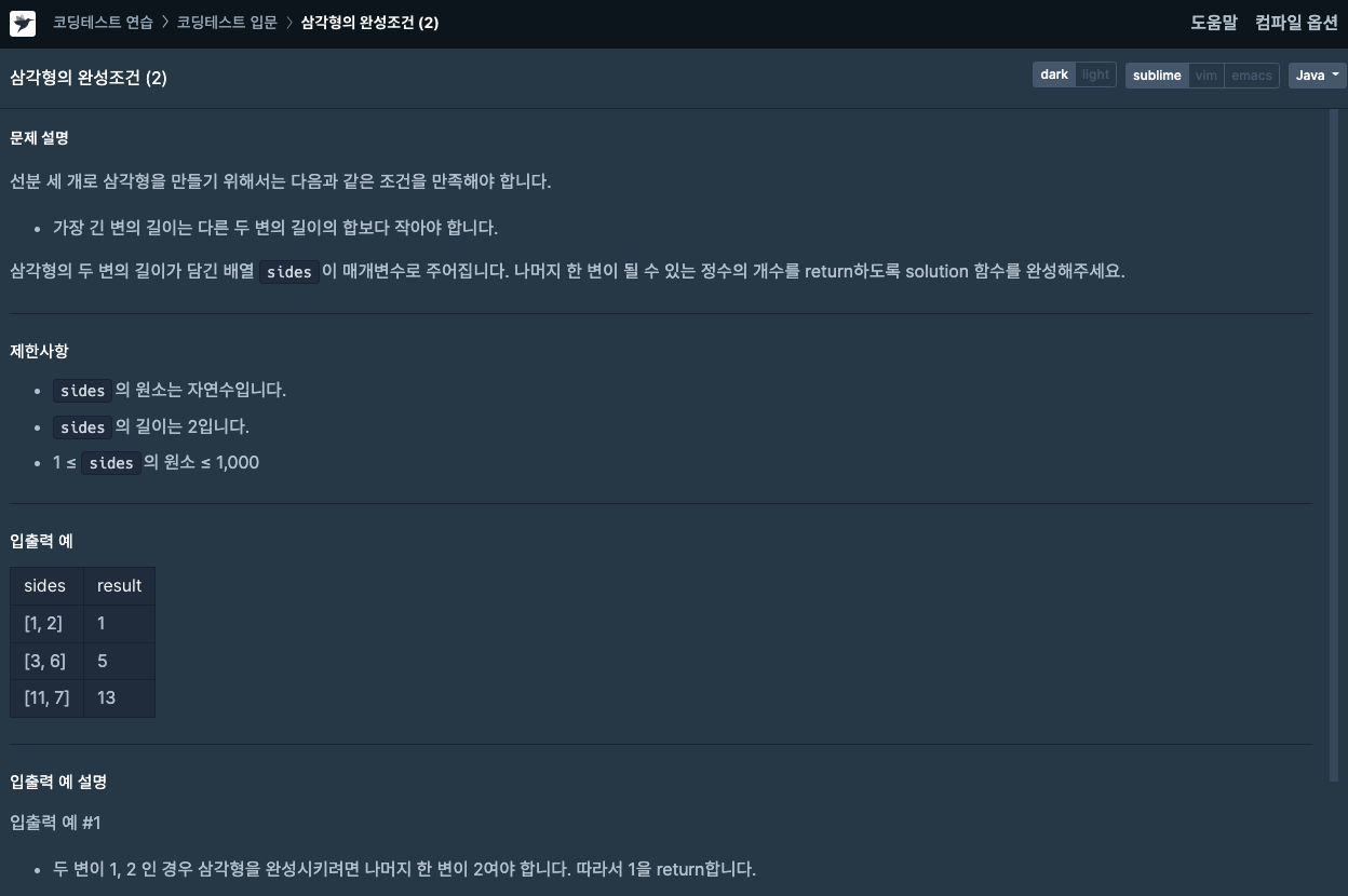 1. 나머지 한변의 길이의 범위는 두 변의 길이의 합까지로 한다.(나머지 한변의 길이가 가장 길 경우일 때 나머지 한 변의 길이가 최대값이기 때문)