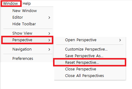 Window > Perspective > Reset Perspective를 통해