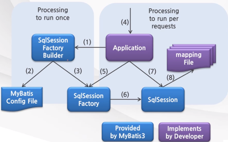 파란색 부분은 MyBatis에서 제공하는 클래스 및 설정 파일이다.