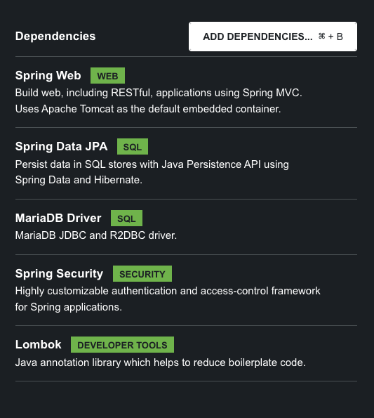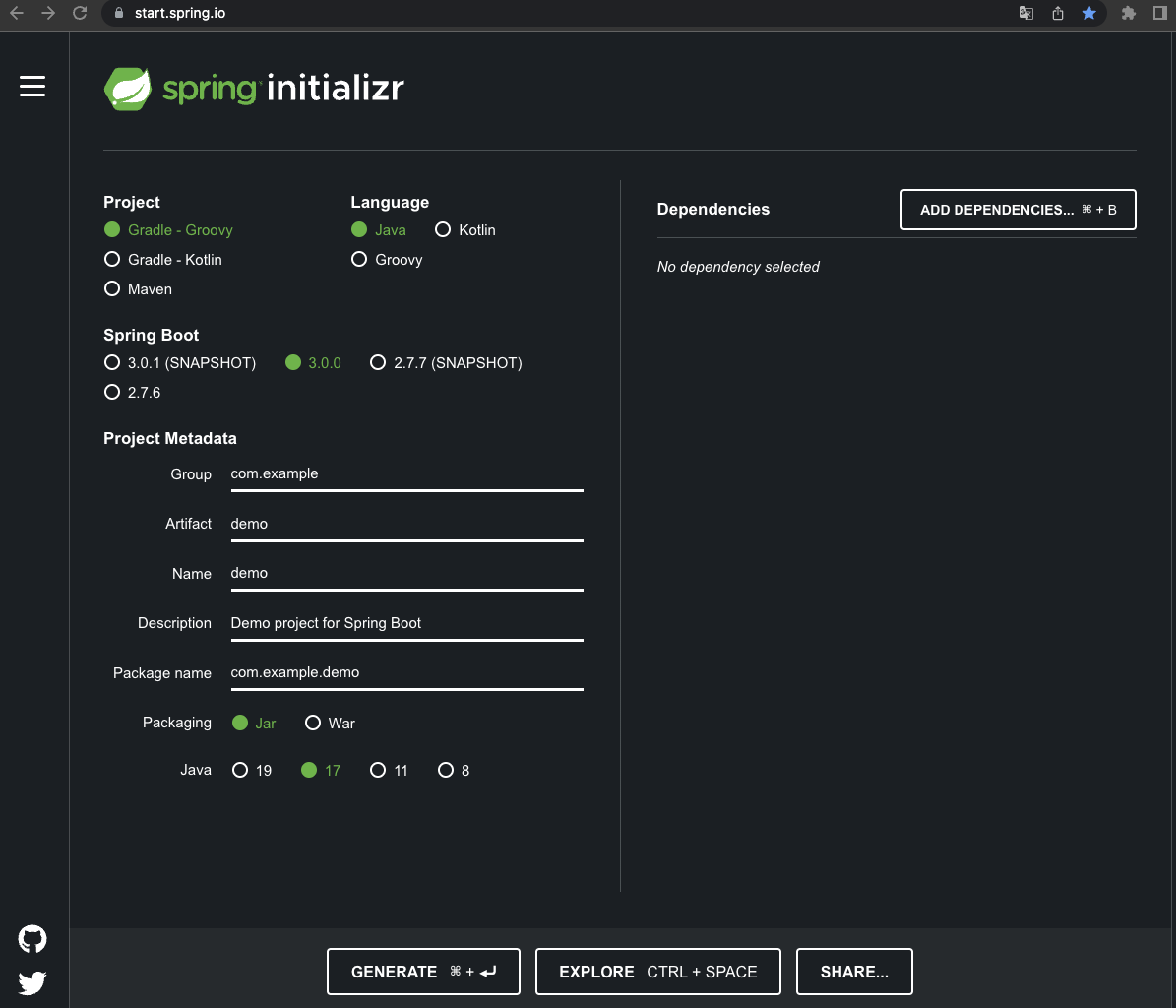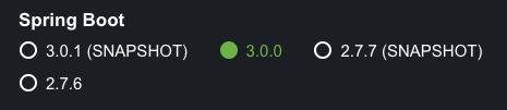 Spring Boot 버전은 SNAPSHOT이 아닌 버전을 선택한다.